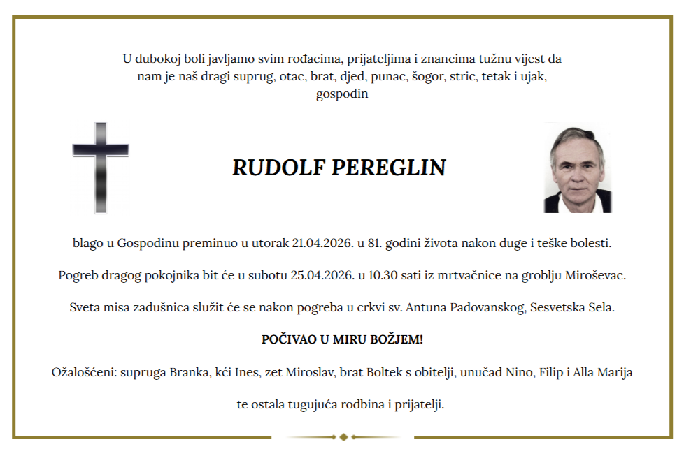 S velikom tugom i boli opraštamo se od našeg člana, gospodina Rudolfa Pereglina, koji nas je napustio nakon duge i teške bolesti.